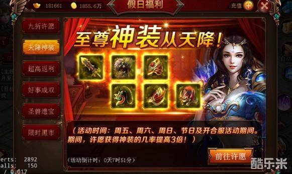 如果错过了开服,那就不要错过节日,比如周末啦,国家法定节日啦,都会有各种活动的,这个时候充值不仅有额外赠送,还可以许神装,平时许愿时没有神装的哦!