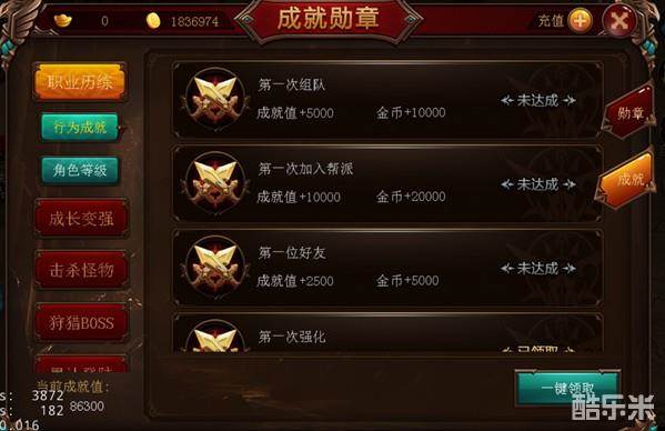 当有已完成的成就时,系统会自动提示您完成但未领取的成就奖励。成就奖励不仅包括成就积分,还有大量的金币奖励哦!