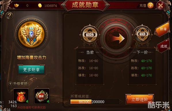 积累一定成就积分就可以获得成就称号,领取相应成就勋章,勋章可以为玩家大大的增强战力哦。点击成就界面下方的【成就勋章】按钮即可进入成就勋章兑换界面。