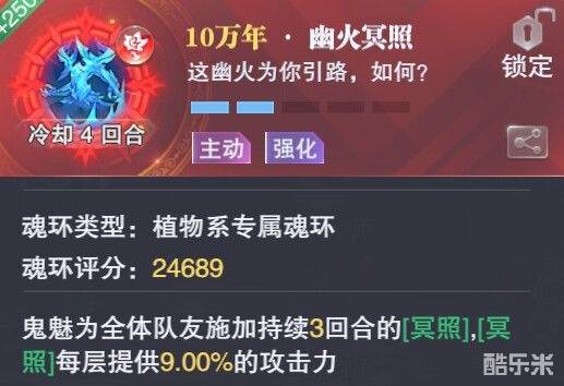长图提升4-1技能【冥照】的增伤幅度开局先机给敌方全体施加持续全场的【魂锁】,其主要效果是为了减伤,另外鬼魅在战斗前2回合可以免疫群体伤害2-2技能【魂归】可以主动使用,在鬼魅1回合内让全体友方有具备【回溯】的不死效果,此效果和鬼魅原本的【回溯】没有冲突
