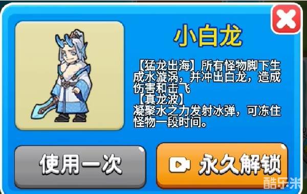 5.然后我们就获得小白龙了,技能为猛龙出海:所有怪物脚下生成水漩涡,并冲出白龙,造成伤害和击飞,真龙波:凝聚水之力发射冰弹,可冻住怪物一段时间;