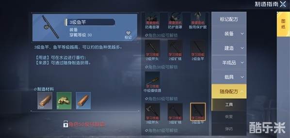 3级鱼竿需要玩家达到50级以上,可通过随身制造完成拥有。