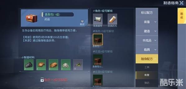 在这之中,这些急救包一般是通过随身制造制作获得的,但前提是玩家准备的材料足够,如1级急救包需要消耗3铁矿、3残破兽皮、3杉树皮、3草棉籽以及15草木纤维等。