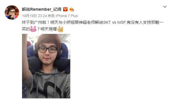 在昨天深夜解说记得更新微博,称今天将与苏小妍和神超解说SKT vs MSF的比赛。