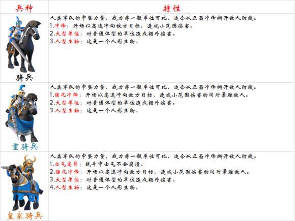 作为人族唯一的一个非普通单位,骑兵肩负着人族伟大复兴的光荣使命。首先,最亮眼的就是那个冲锋技能,也就是骑兵一切的核心。冲锋的技能非常关键,常常决定了一场战斗的胜负,打野也是手到擒来。冲锋给不擅长爆发的人族增加了爆发的可能性。冲锋的意义在于以点破面,用两排甚至三排骑兵一起冲锋,利用冲撞力打开敌人部队的一个缺口,迅速塑造局部的士气爆发,进而延展到整个队伍。如果骑士的冲锋没有能在最快时间引起局部士气爆炸,那么基本上算是功能大减甚至不痛不痒。因此冲锋这个亮点是人族必备骑士的最主要原因。你可以不把骑士当主力坦克,而选择剑士,但你必须要拥有这只能够关键时刻撕裂防线突袭的队伍。金银卡强化后的效果则更加宝贵,群伤加控制又能多赢的一些输出时间。第二,骑兵占地面积小,人数也不算多,毕竟大型单位,攻击效率很高,搭配骑士的冲锋技能,和高攻速,能在最快速度和敌人交手并且造成伤害,很适合打开局面,配合集火或者人族的其他AOE技能,灭掉一支队伍可能就是制胜的关键。第三,骑兵移动力强,机动性强,在战场上迂回的速度也快,行动比较麻利,很多AOE技能都能闪的七七八八,比如坦克基本打不中,而且一旦防线撕裂,骑兵在敌人后排的杀伤力是非常惊人的,可以保持士气连续爆炸不掉下来。最后,我想说一下士气高昂的技能,这也是我推荐人族选择金卡骑士的原因,免疫负面士气对一个前排来说太重要了,意味着骑士的高血量能持续抵挡敌人的输出,直到最后一个人,这给我方的进攻争取了非常宝贵的时间,而且骑兵精兵简政,伤亡的几率也相对较小,很适合人族得突袭队伍,用最锋利的刀,从最薄弱的一点彻底瓦解敌人。