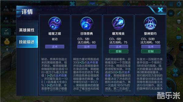 二技能-曜龙烛兆:东皇太一消耗黑暗能量体,召唤曜龙对一个范围进行冲击,释放后获得短暂加速效果,冲击将造成法术伤害。黑暗能量体的数量,决定了冲击的次数和威力,第一、二次造成减速效果,第三次冲击造成范围击晕。