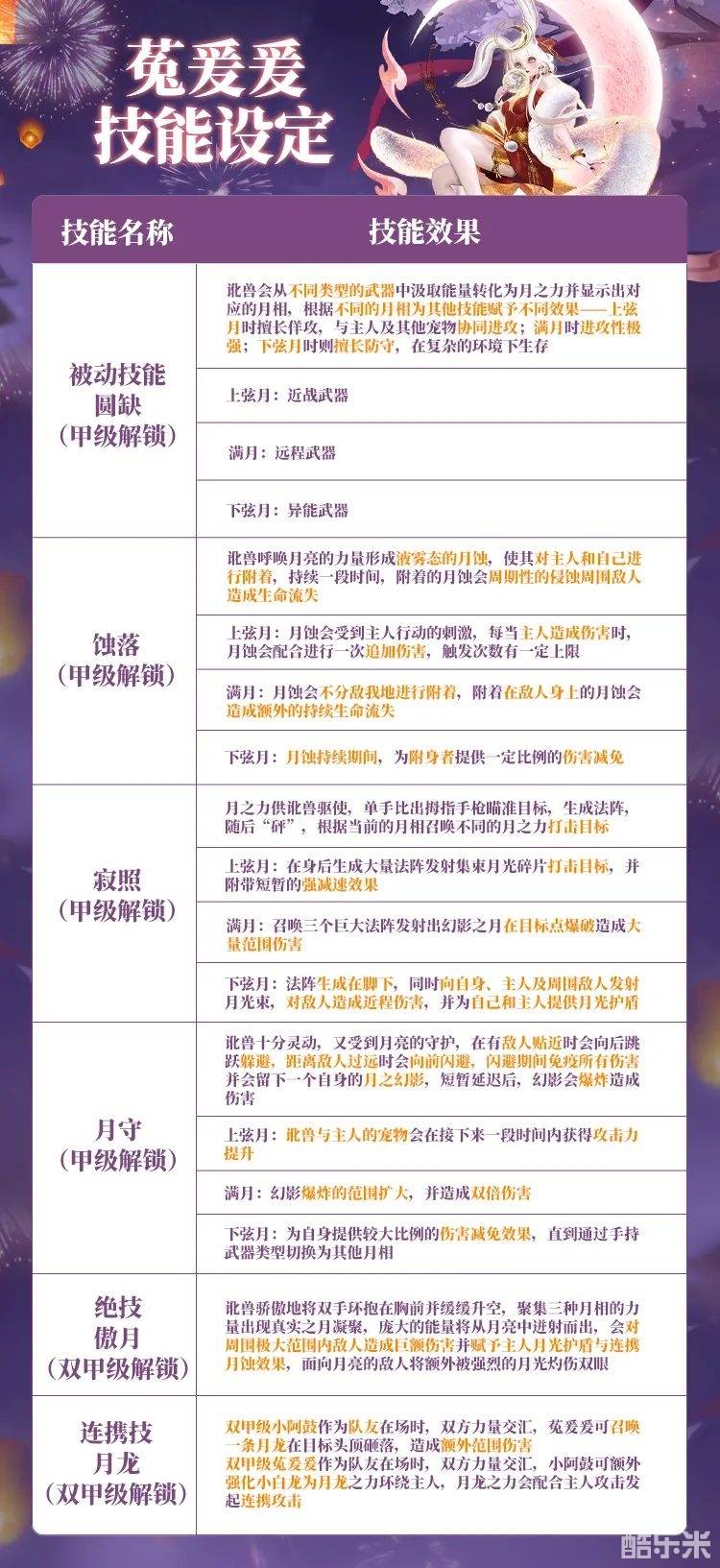 丁级菟爰爰初始即有三种武器专精,近战(双刀)、远程(连珠铳)、异能(停云扇)各一种哦~甲级时解锁被动技能【圆缺】——可以根据自身当前所持武器改变主动技能效果(身后月亮形态也会改变哟),当她释放主动技能【蚀落】/【寂照】/【月守】时,也会根据手持武器的不同,达成完全不同的效果,如使用近战武器时会和主人及其他宠物协同进攻,使用远程武器时进攻欲望强烈,使用异能武器时更擅长防守,使用主动技能也会受到武器偏向影响展现出完全不同的效果!