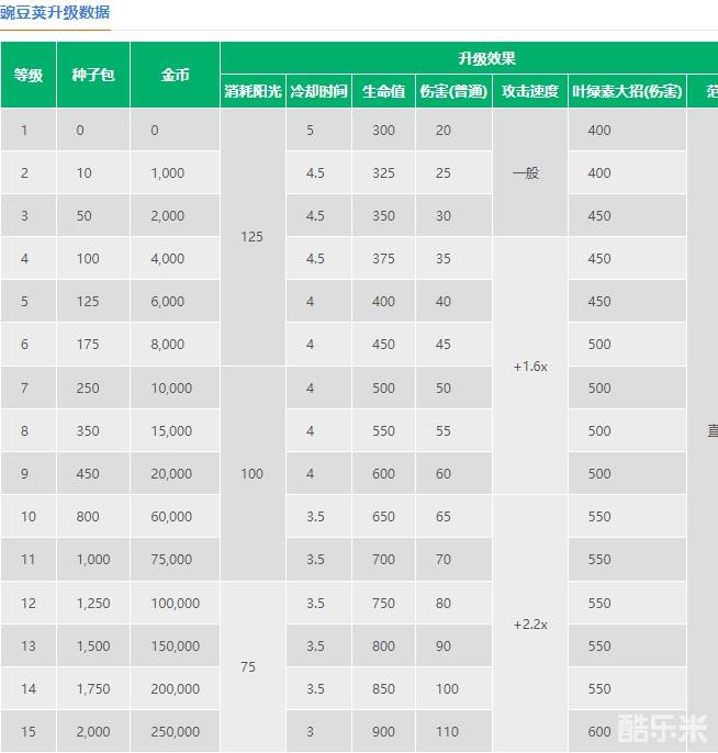 植物大战僵尸2豌豆荚战斗数值一览