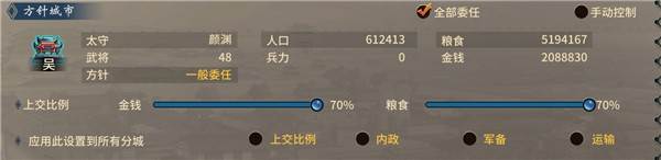 【应用到分城】:一键应用该城市第一块【上交比例】、第三块【内政】、第四块【军备】、【运输】到所有委托分城。