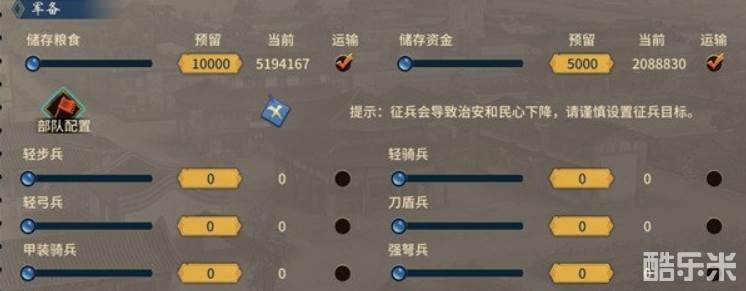【队伍配制】:增加特种兵配制,添加后效果同上,区别是特种兵只能特定城市征召而后运输到该城市设定预留多少,超过的运输到下一个城市。