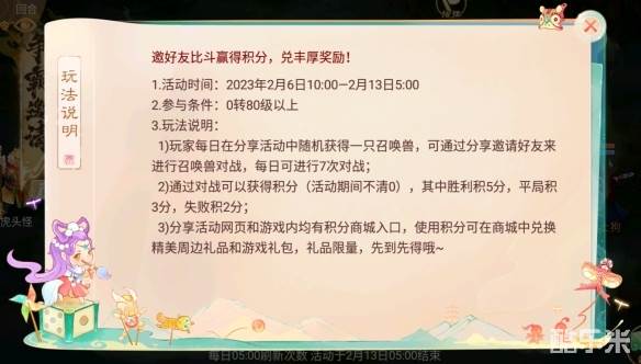 2023年2月6日10:00-2月13日5:00期间,侠士在分享活动中绑定游戏角色后,每日登录活动页面就可随机获得一只召唤兽,召唤兽包含普通-高级-特殊-神兽-珍稀五种随机的品级。(H5活动比斗为随机胜负,与每日所获取的召唤兽品级无关)