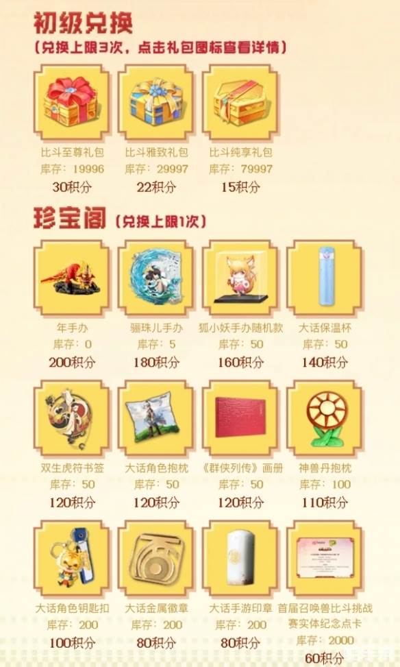 活动中累积的积分可以在H5及游戏内中兑换道具礼包、实物周边奖励,活动奖品包含年手办、骊珠儿手办、狐小妖手办等大话西游周边,还有首届召唤兽比斗挑战赛实体纪念点卡、以及比斗至尊礼包等海量奖励!