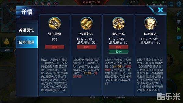 技能解析:一技能的移速加成提升了刘备的机动性,使其可以更为自如的进行追击或撤退,下次射击时可以击发两次,从而造成额外的伤害,在前期刷野时,一技能可以帮助刘备快速地刷野发育,移速效果也能帮助其更好的入侵野区杀伤敌方打野,在进行线上GANK时,利用一技能可以快速赶到线上,从而极大地确保GANK的成功率,团战时,一技能可以对敌方脆皮输出造成高额的伤害,从而将其击杀。