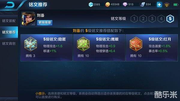 这套五级铭文推荐为刘备提供了攻速、暴击率、物攻、物穿和移速的加成,方便刘备打出更高的伤害输出,物穿的加成确保了刘备的伤害可以很好的作用于敌方,即使是对战敌方的坦克英雄,也可以造成很好地血量消耗。