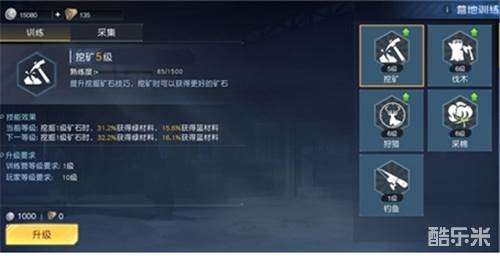 3、技能升级:挖矿、伐木、狩猎、采棉和钓鱼技能,每次升级都需要耗费银币。