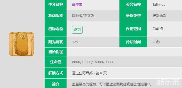 1.高坚果(Tall nut)是《植物大战僵尸2》拥有高防御力的植物,可以阻止试图跳过或越过他的殭尸,具有与坚果相同的冷却时间,但具有两倍的生命值。