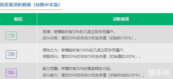 2.高坚果能够克制所有拥有跨越植物的能力的殭尸,不过还是会被僵尸洗冰车、投石车殭尸、玩偶匣殭尸和巨人殭尸秒杀,或者被梯子殭尸给搭上梯子从而使其失去作用
