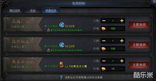 通过切换活动页签,可花费钻石将昨天没有完成的恶魔广场、血色城堡、黄金蛋的剩余次数快速完成.