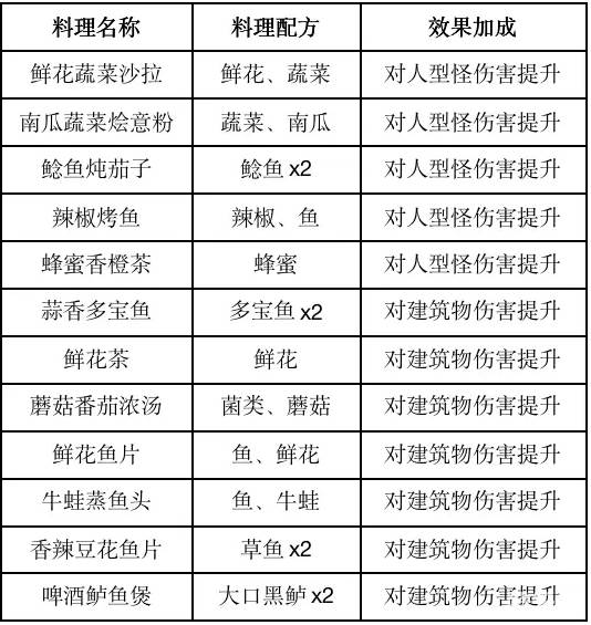 食谱分:共七种,分别为:弱辐射伤害、提升血量、提升伤害、伤害减免、回复饥饿、提升护甲、特殊料理等,具体效果如下。