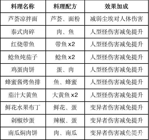 伤害减免提升食谱分成三类:减弱尘埃对人体的危害、人型怪伤害减免提升,污染者伤害减免提升。