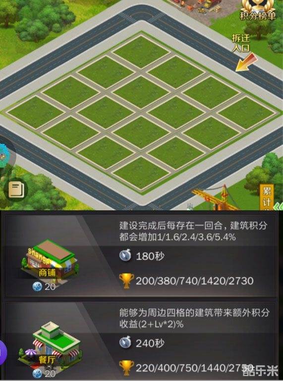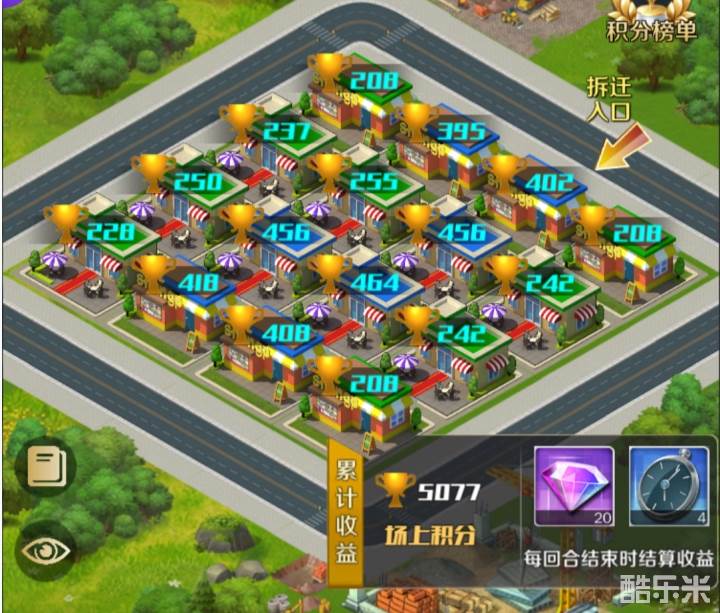 1、每天早上10点开始一直持续到晚上10点准时结束,1小时为1个回合,一共12个回合,从10点开始,每逢整点系统就刷新拆迁币,玩家通过拆迁币来刷新购买1级房子,餐厅的基础积分值最高并且还可以给周围4格房子增加额外百分比积分提成,那么理想的最完美的方案就是16个高级餐厅互相叠加积分提成。