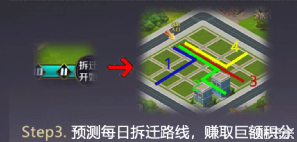 3、晚上9点整,系统给最后一次拆迁币来购买和刷新,9点50分的时候,一定要多升级高级房子预测安排拆迁路线,10点整准时拆迁,不要错过时间损失巨大的收益。拆迁路线的起点每天都不一样,拆迁会从每日的入口起点开始随机拆,起点拆到随机的一个边,每拆一个房子10倍积分,建议把起点的箭头方向多安排几个高级的房子。