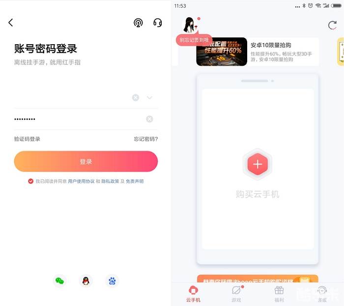 2.注册登陆红手指,第一次使用需要先购买一台云手机。