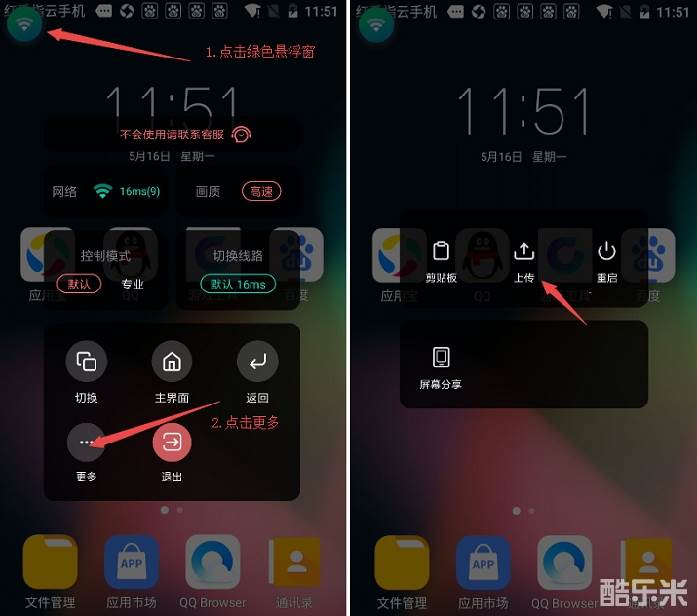 3.进入云手机,点击悬浮球,选择上传、自动安装,即可一键将手机本地的部落冲突手游和一些游戏工具,快速安装到云手机里。