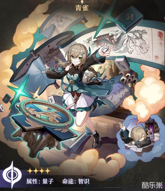 青雀是一名智识命途的量子属性角色,拥有独特的「帝垣琼玉」机制。她抽取琼玉牌,当琼玉牌达到四张同色时,青雀将获得强化普攻并可以对多名敌方造成伤害。