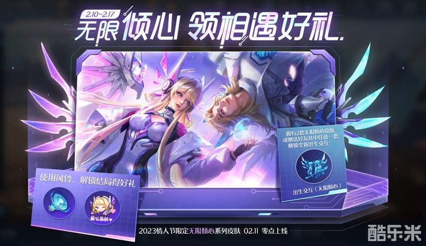 活动期间参与活动解锁梦境,即可领取全新限时语音“一箭穿心!”、“一见倾心~”、表情体验卡等奖励;达成额外条件还可领取全新出生交互(无限倾心),获得后自动装配,当我方阵营同时穿戴虞姬&项羽-无限倾心系列皮肤后可触发泉水出生交互。