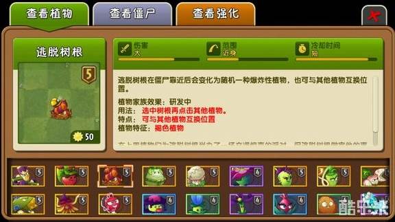 逃脱树根,俗称bug树根,因为这个植物能弄出来的bug简直是数不胜数,最著名的当属无敌树根与悬空卡植物树根,一到四阶除了卡bug、天空无尽配合药师游击战术外,普通关基本上都是单纯的拿树根当个廉价的灰烬植物用,而五阶后的用处就比较大了,俗称第二能量花,不仅能够使其他植物打出应有的伤害,而且能够节省很多能量豆消耗,尤其是后期能量花不够用的时候,完全可以考虑将五阶树根当做能量花来用,新增添了一种辅助职能,而且能够卡新bug,升五阶也是稳赚不赔的