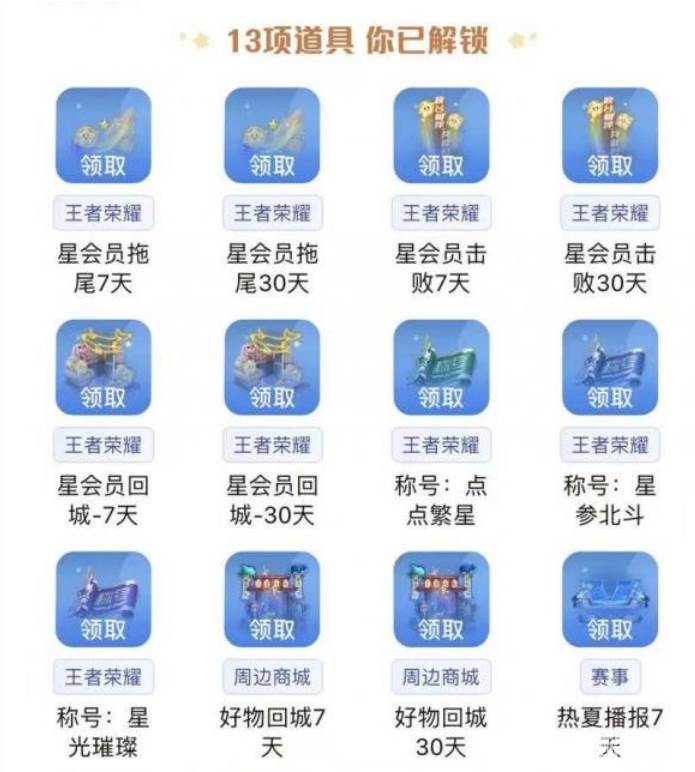 11级:营地加速器4小时/周、永久好物回城、满天星斗称号