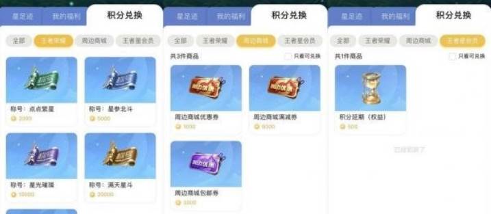 除了星会员等级外,在获得成就的时候,还能得到积分,可在积分兑换商城里面兑换道具,有称号、优惠券、满减券、包邮券、积分延期权益,具体兑换如下图所示: