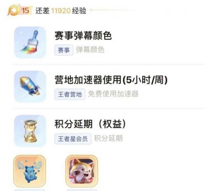 15级:赛事弹幕颜色、营地加速器5小时/周、积分延期(权益)、梦奇永久皮肤天降福星,天降福星个性动作