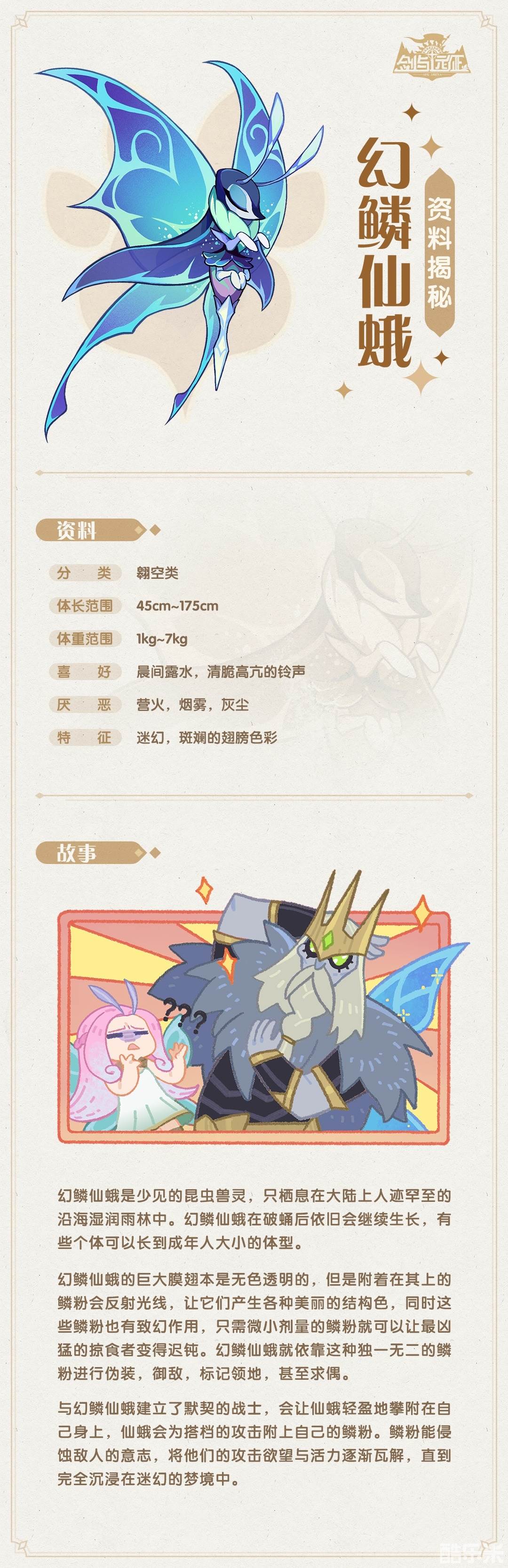 幻鳞仙蛾是少见的昆虫兽灵,只栖息在大陆上人迹罕至的沿海湿润雨林中。幻鳞仙蛾在破蛹后依旧会继续生长,有些个体可以长到成年人大小的体型。