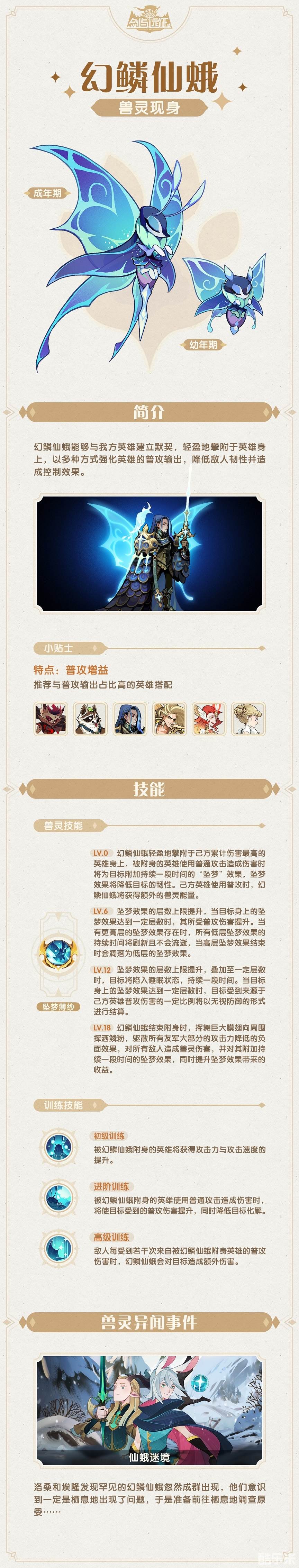 LV.0:幻鳞仙蛾轻盈地攀附于己方累计伤害最高的英雄身上,被附身的英雄使用普通攻击造成伤害时将为目标附加持续一段时间的“坠梦”效果,坠梦效果将降低目标的韧性。己方英雄使用普攻时,幻鳞仙蛾将获得额外的兽灵能量。