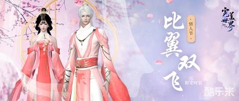 情人节限定时装-比翼双飞、比翼双飞·头饰伴着春日里的第一缕暧昧清风,吹入完美大陆!纯净的樱粉色,腰间修身的曲线设计,走路带风的裙摆、飘带,金饰的勾边搭配,宛若画中走来的娇俏仙女和俊朗公子,粉色绸缎宛如一朵温柔的春花待开,散发盎然的春意,既纯净又震撼,浪漫迎面而来!划重点:全服免费领!