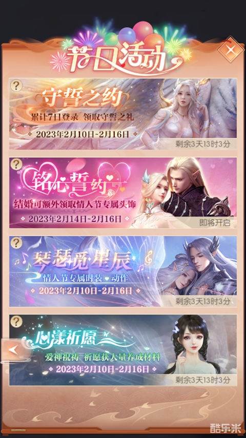 活动奖励:观星仪(情人节活动“琴瑟觅星辰”道具),红线(使用后增加彼此好感度50点),专属头饰-比翼双飞(7天)。