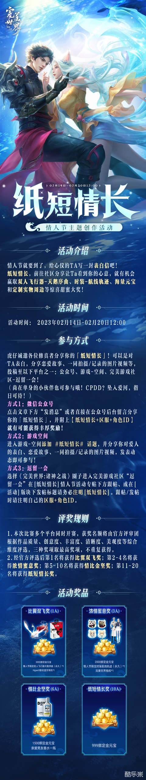 又到了属于甜蜜情人节的二月,完美大陆为各位修真者们准备了丰富的情人节活动!登录游戏即送情人节大礼,参与游戏内活动更能免费获得情人节限定外观、限定单人动作等丰厚奖励!更有【纸短情长】情人节主题创作活动,永久双人飞行器、海量元宝以及定制实物周边等你来拿!2月10日至2月16日,快叫上你的CP一同共赴星辰蜜语吧!