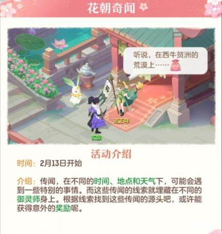 2、花朝奇闻介绍:传闻,在不同的时间、地点和天气下,可能会遇到一些特别的事情。而这些传闻的线索就埋藏在不同的御灵师身上。根据线索找到这些传闻的源头吧,或许能获得意外的奖励呢。