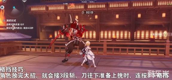 格挡技巧:接角色大招结束后,会放这个技能,看见刀往下准备上挑时,连按3下格挡