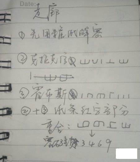 解密思路:先解开盒子密码(才可破获牢门密码线索)盒子密码要用到的线索是囚犯图片,如图,按照右边的单词字母顺序,把左边的字母连起来,观察所相似的数字,即face=4、the=7、desthny=9