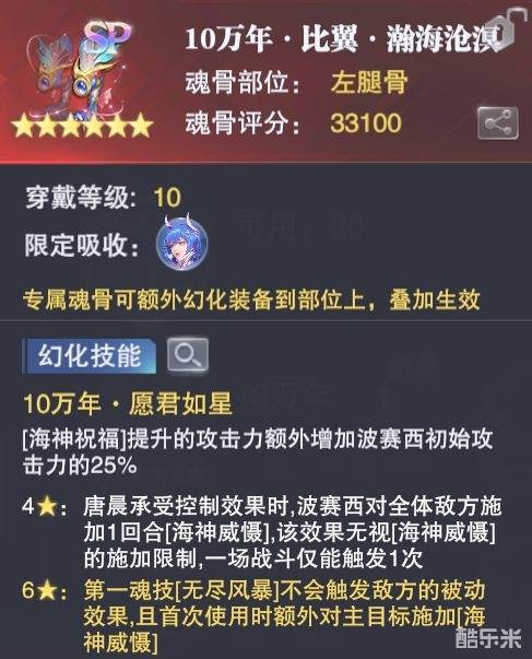 基础效果为长图增伤,可以将记录值的伤害比例从35%提升到50%,幅度不低,但作用场景比较有限,目前来看唯有神墟悬赏的控制boss中能用得上4星效果具体有两个作用场景,其一是PVP中跟随波赛西1技能释放后的连续追击,这样可以快速触发【狂戮刃】的【斩杀】buff,大幅提升唐晨在PVP中的作战强度,但这点需要大家同时拿到波赛西左腿专属魂骨并升级到6星后才能发挥最强联动效果,因为......没到6星你一个【无尽风暴】过去,对方强敏攻的反击就可能把你团灭了;此外这个效果的第二个作用场景为长图,当波赛西使用1技能且触发第2次【妖眼魔树】buff后,唐晨的多次追击可以一定程度上提升二次妖树的记录值伤害,从而提升最终的长图伤害,但作用场景依然有限6星效果就是无脑的强化1技能输出,且无视伤害免疫效果也进一步提升了唐晨未来在PVP中的强度,联动4星的追击效果,可谓强无敌