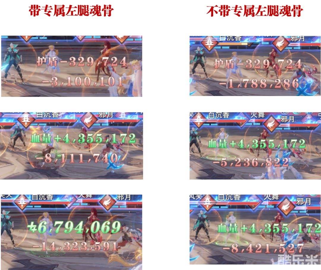 首先针对基础增伤25%是每层还是总共的问题,带了个攻击力非常低的白沉香和波赛西搭配测试,大家从上面的左列和右列对比图便能发现,第一排是2层祝福的伤害,第二排是4层祝福的伤害,最下面一排是6层祝福的伤害,假设在6层祝福时,未带左腿专属魂骨的波赛西总攻击力增伤比例为270%,那么对比800万和1400万的伤害差距,大家可以清晰的知道这款全新专属左腿专属魂骨的增伤应是每层提升25%,也就是将10万年魂环本身的每层45%波赛西攻击力增伤提升到了每层70%,6层上限就从270%提升到了420%,对于未来的长图副本有非常不错的增幅。