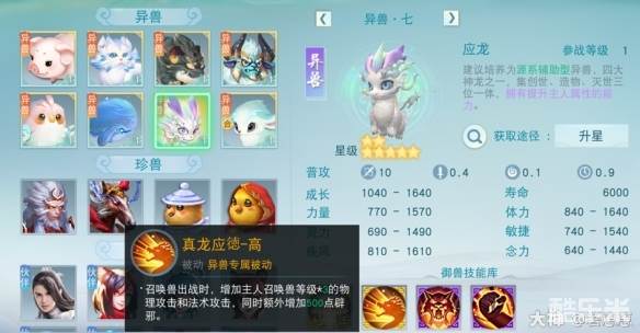 第一只是源系辅助型异兽应龙。应龙的手动技能可以增加主人的攻击和双抗,而它的专属被动【真龙应德】,可额外增加主人的辟邪属性,打满源系技能后,在清理小怪和集火BOSS时都很实用。