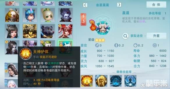 它的手动技能【天神护体】,可以为主人提供强大的天神护体状态。在此期间怪物造成的伤害可减免50%,同时可增加50%对怪物的伤害。