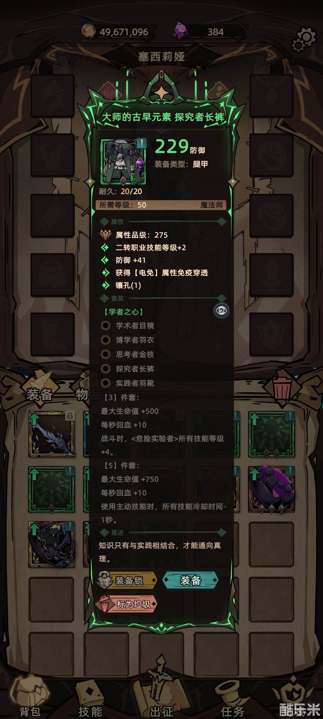 左边学者套由于获取难度极大,词条优先选择带孔,其次全元素增幅。 右边项链神选,词条最好有一条主属性加成。