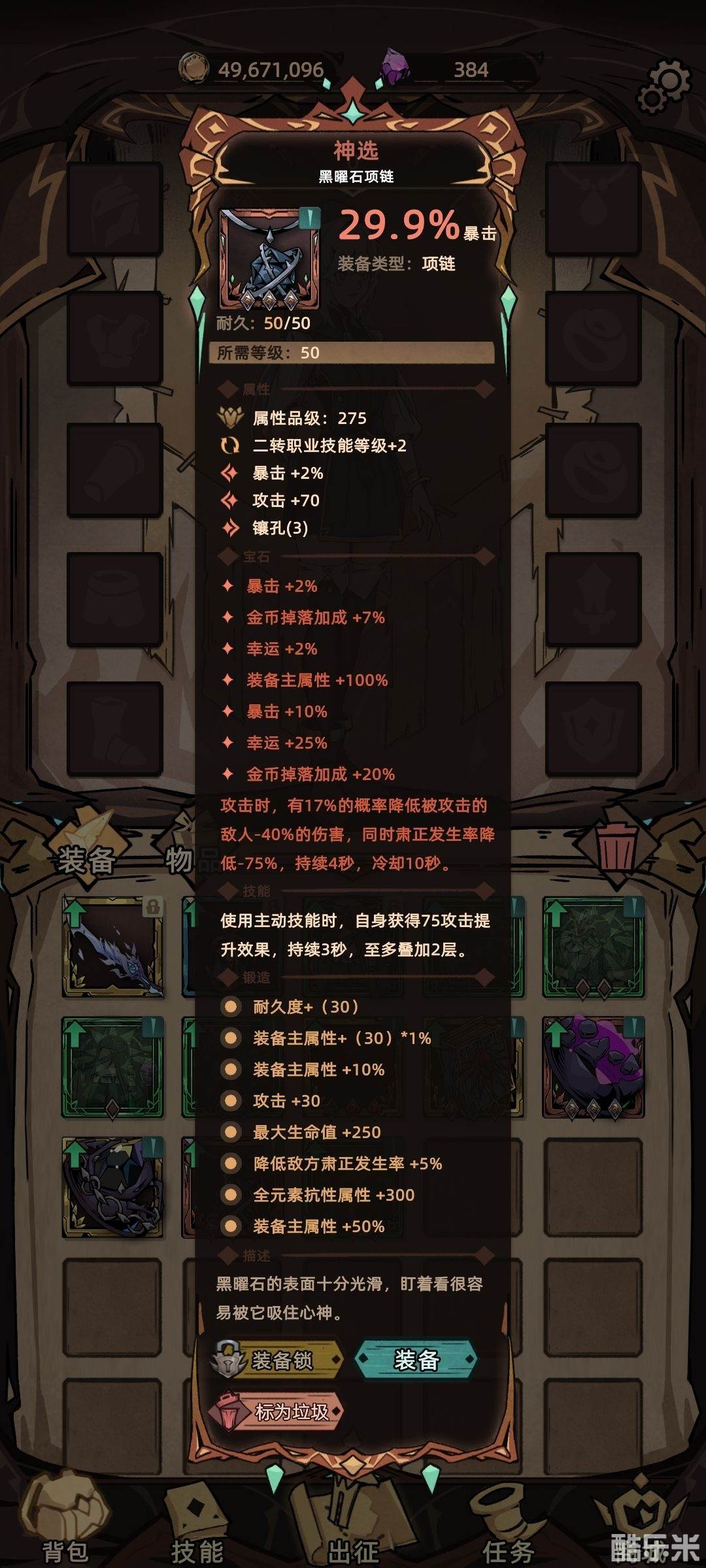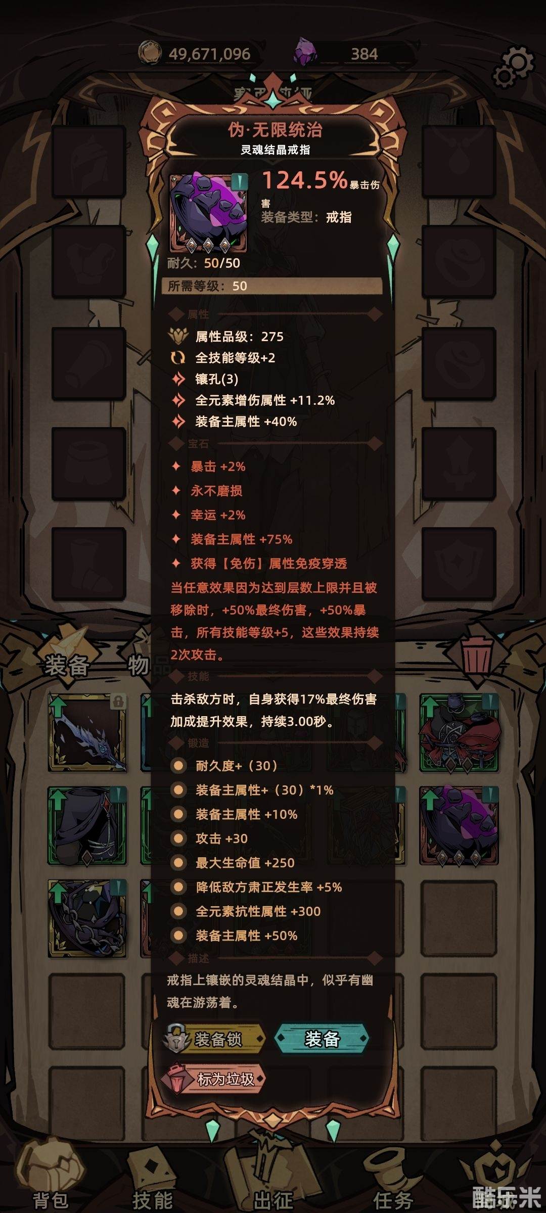 其余词条一定要堆满10级技能等级(无限统治提供5级一共15级,且核心技能新兴学派最高额外加10级),其次选择全元素增幅,最后选择爆伤攻击暴击。另外首饰主属性选择暴击爆伤。