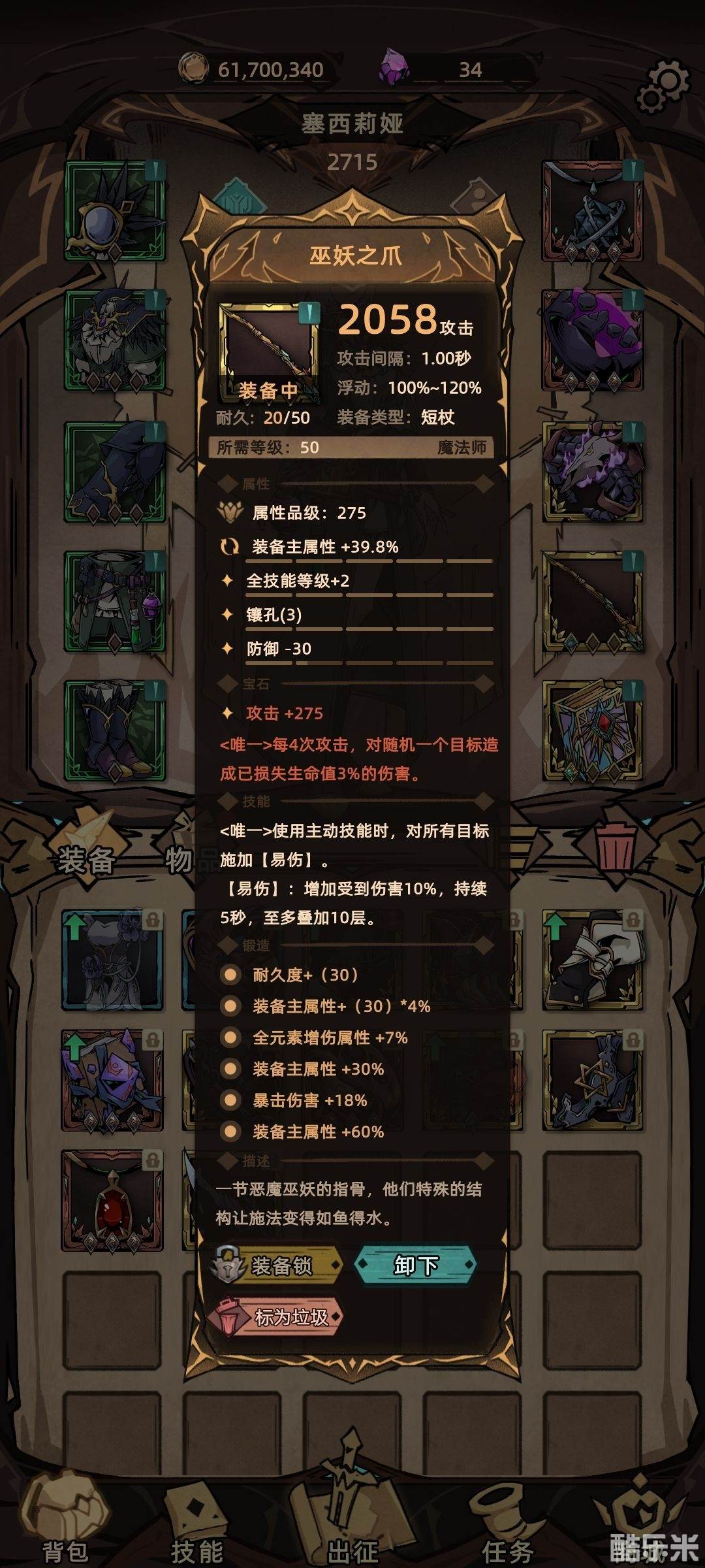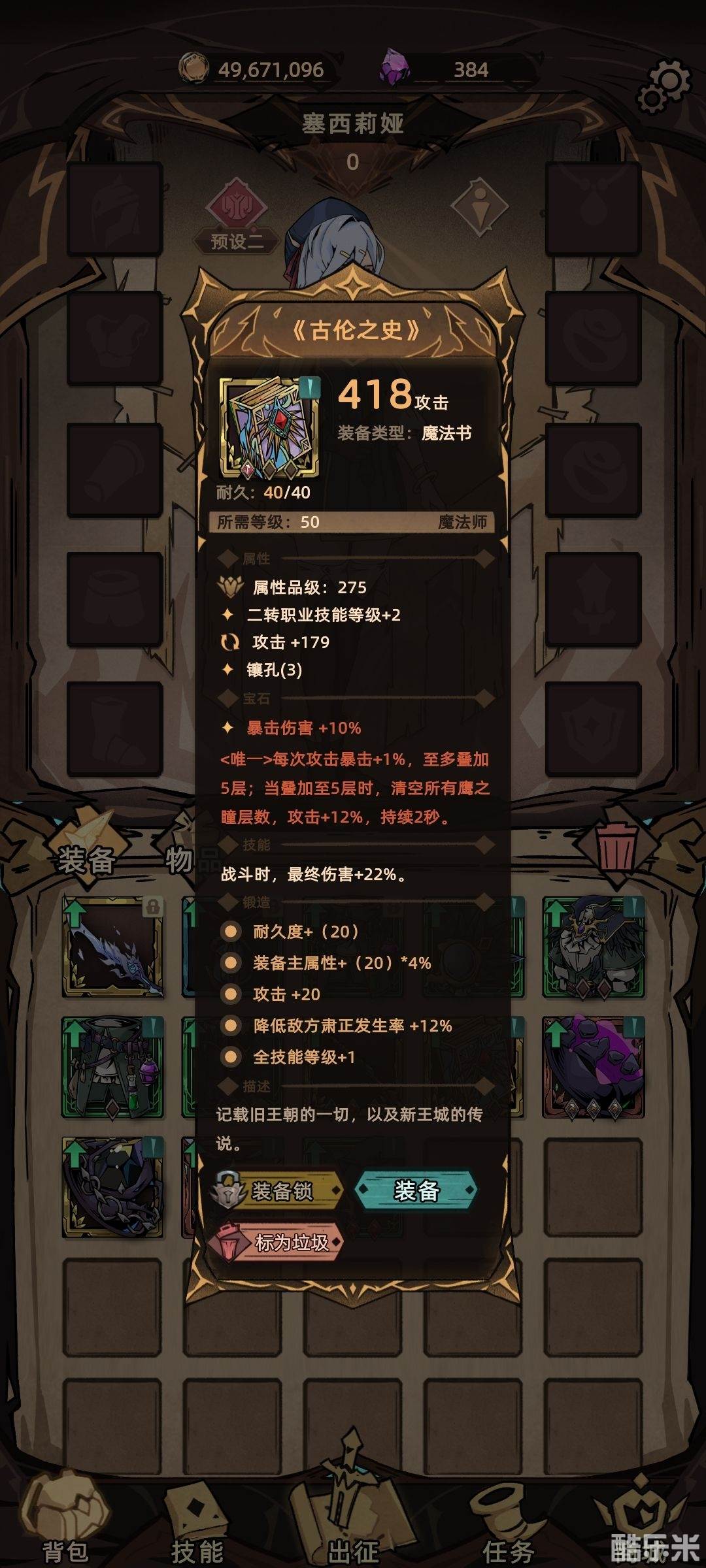 武器推荐巫妖之爪,如果有30级贪欲之刃也可以用。魔法书推荐古伦之史。