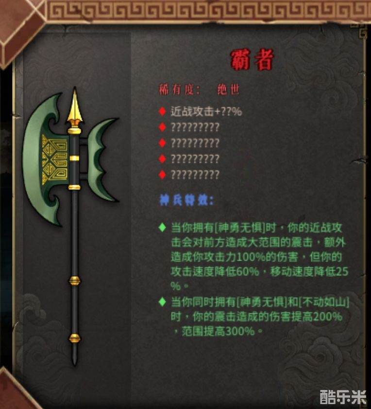 当你同时拥有神勇无惧,不动如山时,配合冷血,虎王,你将拥有一击致命的能力。